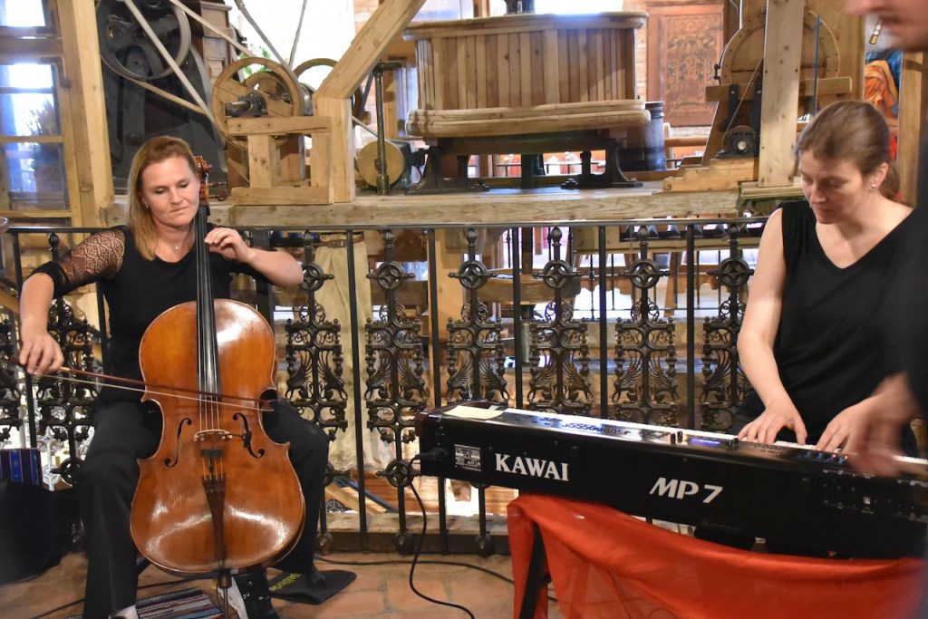 Am Kunstwanderweg zwischen den Bildern erfolgten Stationen mit Musik. An diesem Standort mit Horn. Bei anderen Stationen das Spiel auf zwei Blockflöten gleichzeitig, teilweise mit Regenschirm.Im Bild, wir, das Duo Piacello in Aktion, beim Empfang des Kunstwanderweges in der alten Schmiede, und später als Dinner- und Ausklangsmusik in der Stöcklalm.